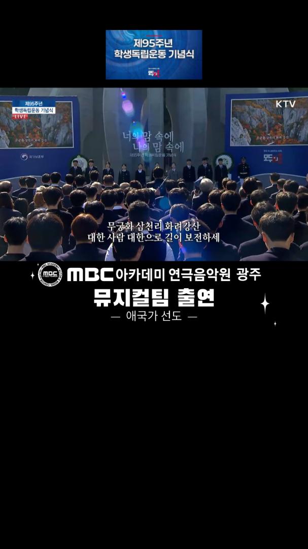 제95주년 학생독립운동 기념식 뮤지컬팀 출연 - 애국가 선도 - 페이지 정보 작성자MBC아카데미연극음악원광주 댓글 0건 조회 2,583회 작성일 24-11-08 19:05 본문 목록 이전글제95주년 학생독립운동 기념식 뮤지컬팀 출연 - DREAM US - 24.11.13 다음글광주광역시 공식 유튜브, 빛튜브 출연 / 키즈센터 조O이 수강생 24.08.21