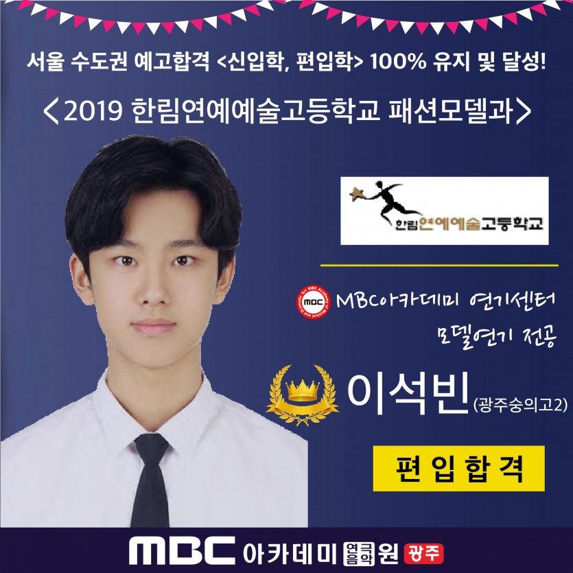 [연기센터-모델연기전공] 이석빈 학생 한림예고 편입학 합격 페이지 정보 작성자 관리자 댓글 0건 조회 33,239회 작성일 19-04-05 17:40 본문 [연기센터-모델연기전공] 이석빈 학생(숭의고 2) 한림예고 편입학 합격 목록 이전글 한예종 연극원 연기과 2020학년도 모집요강 19.04.05 다음글 2019년 전국 청소년 독백&연기 경연대회 준비반 모집 19.03.08