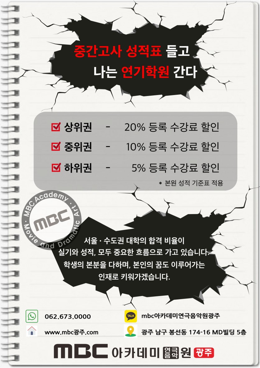 중간고사 이벤트 페이지 정보 작성자 관리자 댓글 0건 조회 32,566회 작성일 19-04-10 20:03 본문 중간고사 성적표 들고 연기학원 간다! 목록 이전글 2020학년도 예고입시반 모집 19.04.12 다음글 모델연기 입시체험캠프 1기 19.04.06