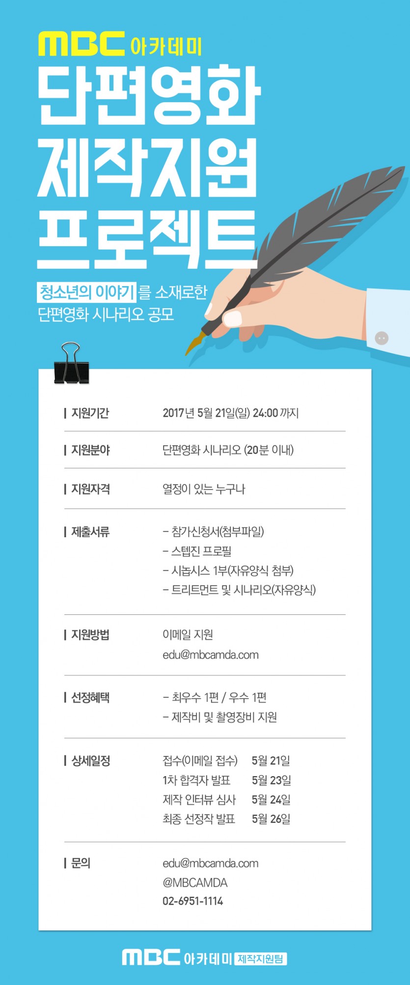 [드라마센터]단편영화제작지원프로젝트 페이지 정보 작성자 관리자 댓글 0건 조회 31,828회 작성일 17-05-08 19:39 본문 첨부파일 단편영화_제작지원_프로젝트_참가신청서.hwp (49.0K) 290회 다운로드 | DATE : 2017-05-08 21:24:34 목록 이전글 2014학년~2017학년 | 드라마센터/뮤직센터/모델연기센터 합격자명단 17.05.11 다음글 [드라마센터]5월지정도서-청소년독백대회 도서 17.05.06