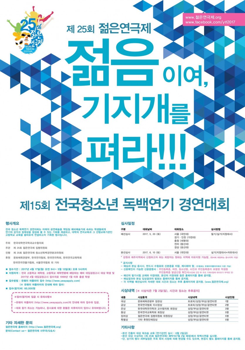 제 15회 전국청소년 독백연기 경연대회 페이지 정보 작성자 관리자 댓글 0건 조회 30,563회 작성일 17-04-11 15:58 본문 제 15회 전국청소년 독백연기 경연대회 목록 이전글 [뮤직센터]합주시설 무료 대여 17.04.22 다음글 [드라마센터] 성인데뷔반 모집 17.04.08