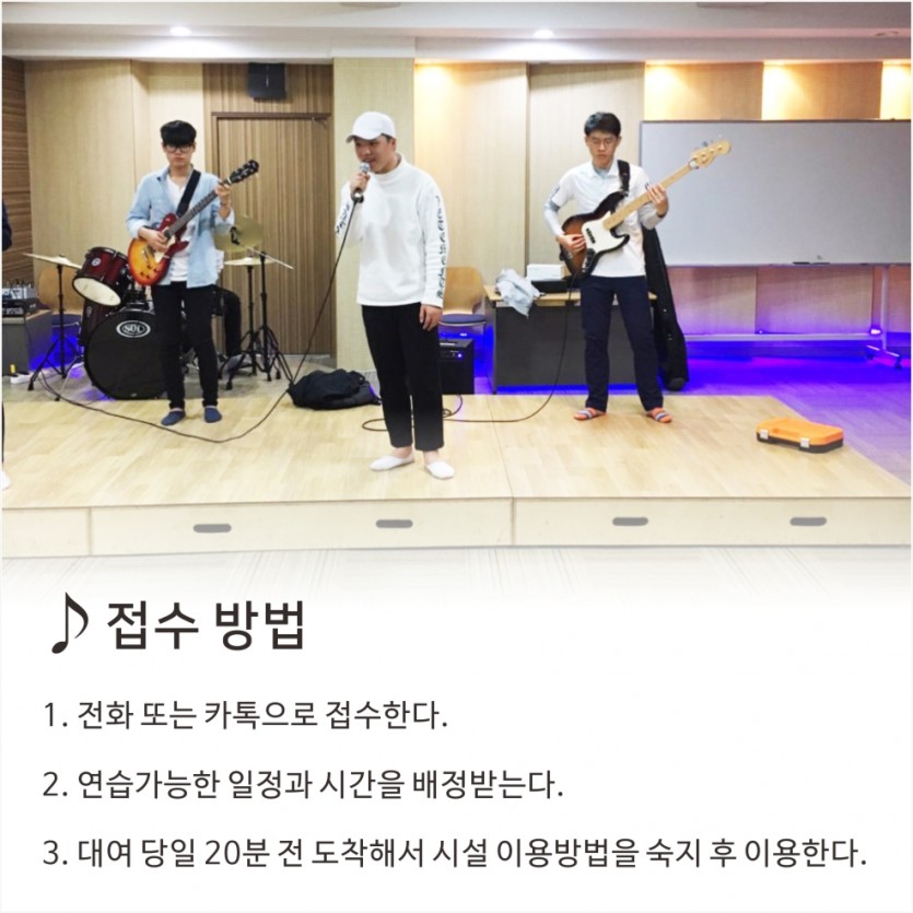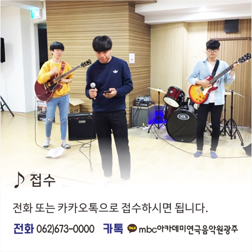 [뮤직센터]합주시설 무료 대여 페이지 정보 작성자 관리자 댓글 0건 조회 30,861회 작성일 17-04-22 16:37 본문 합주시설 무료대여! 관련문의는 전화 또는 카카오톡으로! 목록 이전글 MBC아카데미연극음악원[광주]가 진행하는 중간고사 특별 이벤트 17.04.24 다음글 제 15회 전국청소년 독백연기 경연대회 17.04.11