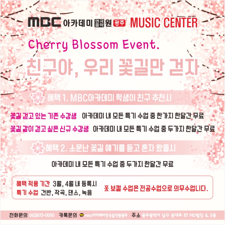 [뮤직센터]벚꽃이벤트-친구야! 우리 꽃길만 걷자 페이지 정보 작성자 관리자 댓글 0건 조회 29,896회 작성일 17-03-03 22:31 본문 새학기 이벤트 벚꽃이벤트-친구야! 우리 꽃길만 걷자 목록 이전글 3월,4월 추천도서 " 벚꽃동산 " 17.03.08 다음글 [드라마센터]벚꽃이벤트-친구야!우리 꽃길만 걷자 17.03.03
