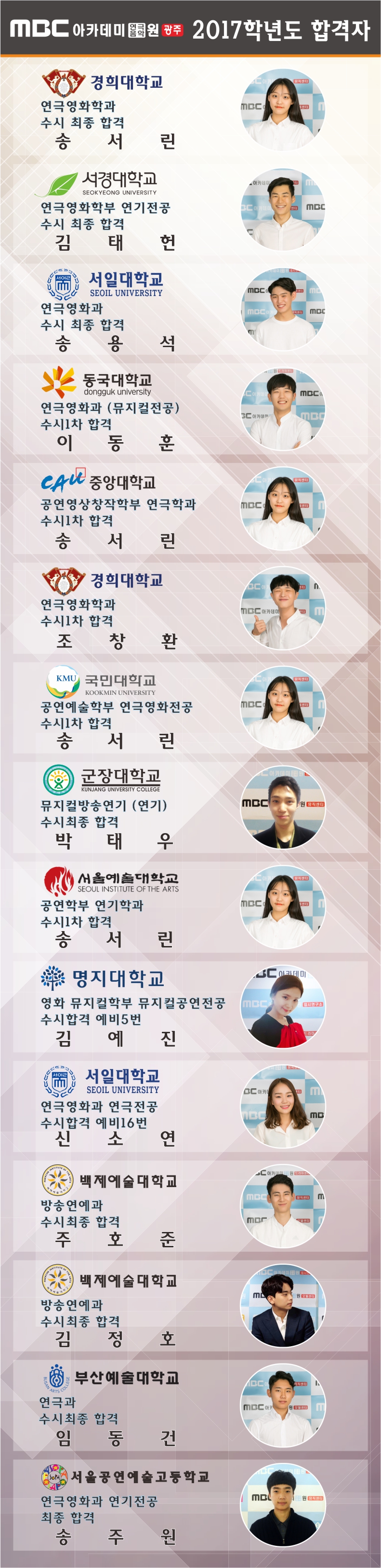 2017학년도 합격자 페이지 정보 작성자 관리자 댓글 0건 조회 29,347회 작성일 16-10-17 18:12 본문 2017학년도 합격자 목록 이전글 [드라마센터] 제4회정기공연 "안네의일기" 광주문화관광책자 "문화마실"에 실리다. 16.10.26 다음글 [뮤직센터] 2016년 10월 무료체험캠프 16.10.06