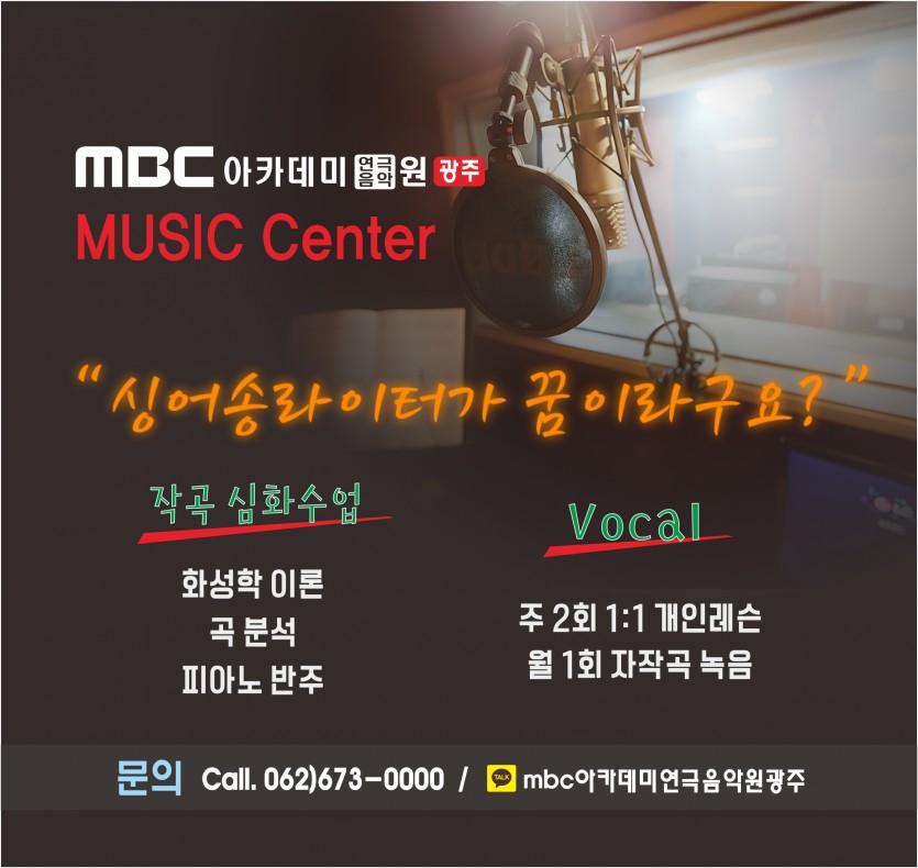 [뮤직센터]싱어송라이터가 꿈이라구요? 페이지 정보 작성자 관리자 댓글 0건 조회 29,649회 작성일 16-11-29 21:14 본문 싱어송라이터가 꿈이라구요? MBC아카데미연극음악원의 뮤직센터로 오세요 ^^ 목록 이전글 [드라마센터]Friendship Week!! 16.12.27 다음글 [뮤직센터]오디션반 수강생 모집 16.11.18