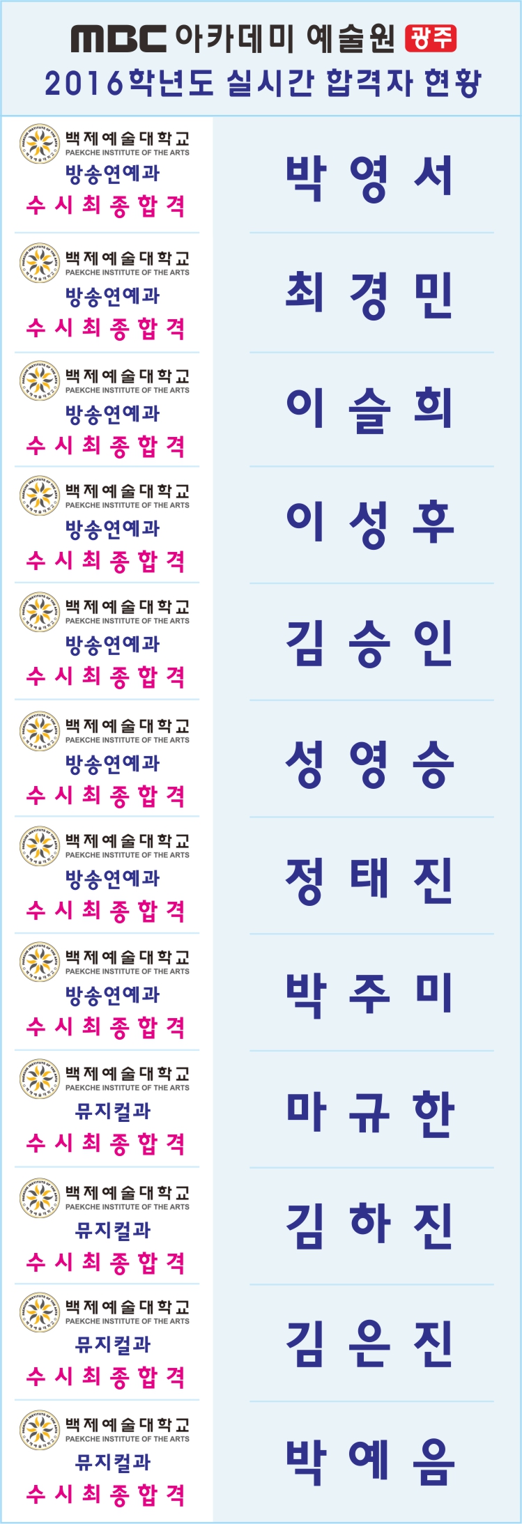 2016학년도 실시간 합격자 현황 [백제예대] 페이지 정보 작성자 관리자 댓글 0건 조회 27,689회 작성일 15-10-21 21:07 본문 2016학년도 실시간 합격자 현황 목록 이전글 2016학년도 실시간 합격자 현황 [호원대] 15.10.22 다음글 2016학년도 실시간 합격자 현황 [서울예대] 15.10.20