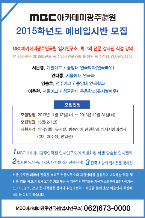 2015학년도 대학 예비입시반 모집 페이지 정보 작성자 관리자 댓글 0건 조회 27,506회 작성일 14-11-12 20:49 본문 MBC아카데미광주연극음악원 2015학년도 대학입시반 모집 - 연극영화과/뮤지컬/방송연예 목록 이전글 (합격자 발표)방송.엔터테인먼트 멘토링캠프 참가자를 모집합니다. 14.11.12 다음글 MBC아카데미광주연극음악원 정기공연#.1 뮤지컬갈라쇼 14.11.12