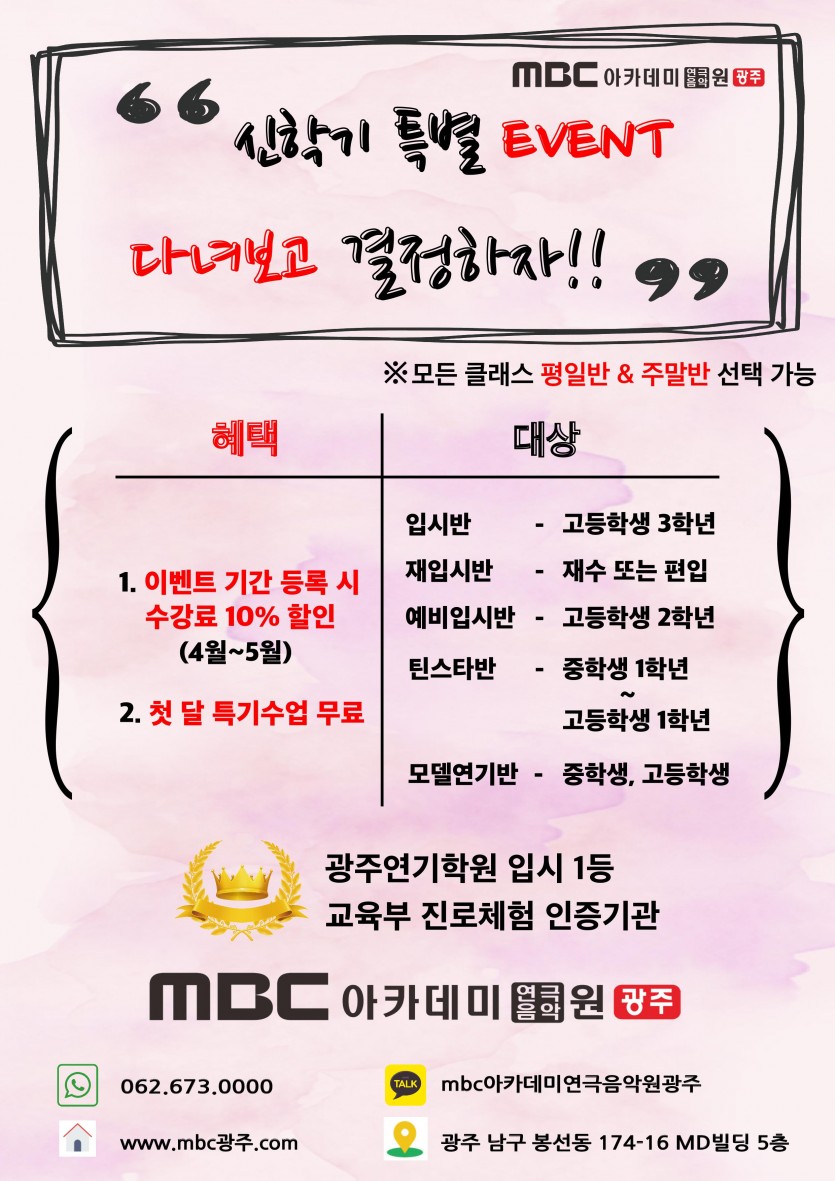 신학기 특별 EVENT - 다녀보고 결정하자 페이지 정보 작성자 관리자 댓글 0건 조회 26,279회 작성일 19-04-02 22:34 본문 신학기 특별 EVENT - 다녀보고 결정하자 목록 이전글 모델연기 입시체험캠프 1기 19.04.06 다음글 <배우특강> 진선규 배우 19.02.08