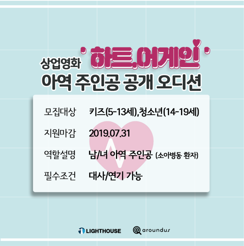 주식회사 라이하우스 E&M에서 장편 상업영화 '하트, 어게인'에 출연할 아역 주인공의 키즈 부문, 하이틴 부문을 공개 모집합니다.