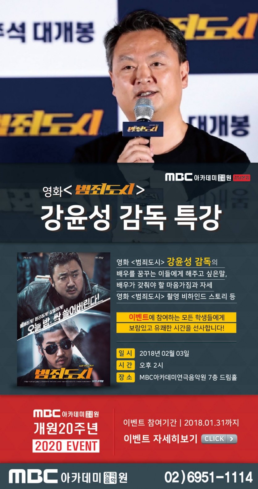 [드라마센터] 영화 '범죄도시' 강윤성 감독 특강 페이지 정보 작성자 관리자 댓글 0건 조회 25,413회 작성일 18-01-11 22:08 본문 영화 '범죄도시' 강윤성 감독 특강 목록 이전글 뮤지컬 취미반 개강! 18.01.27 다음글 [드라마센터] 20주년 기념 장학생 선발 오디션 - 연기 / 뮤지컬 18.01.05