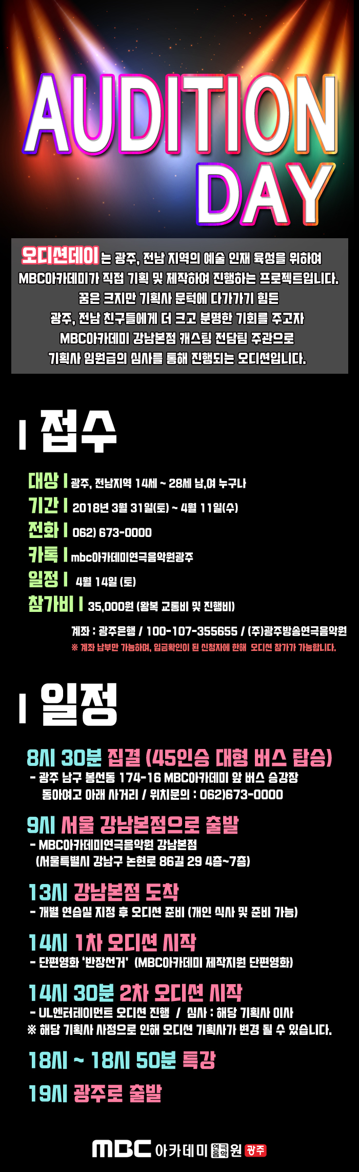 4.14 오디션데이 페이지 정보 작성자 관리자 댓글 0건 조회 24,966회 작성일 18-03-31 12:11 본문 4.14 서울 강남본점에서 진행하는 오디션데이! 목록 이전글 6월 오디션 작품 LIST 18.06.16 다음글 수강생 프로필 무료 촬영 18.03.24