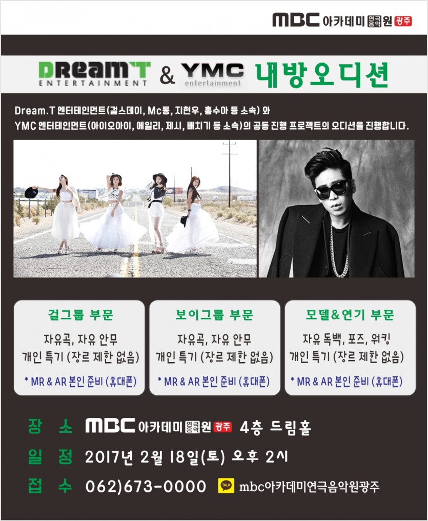 드림티엔터테인먼트&YMC엔터테인먼트 내방오디션 페이지 정보 작성자 관리자 댓글 0건 조회 23,659회 작성일 17-02-08 18:14 본문 걸그룹, 보이그룹, 모델&연기 오디션 목록 이전글 영화 [게이트] 배역 오디션 17.03.13 다음글 FNC 엔터테인먼트 내방오디션 17.02.07