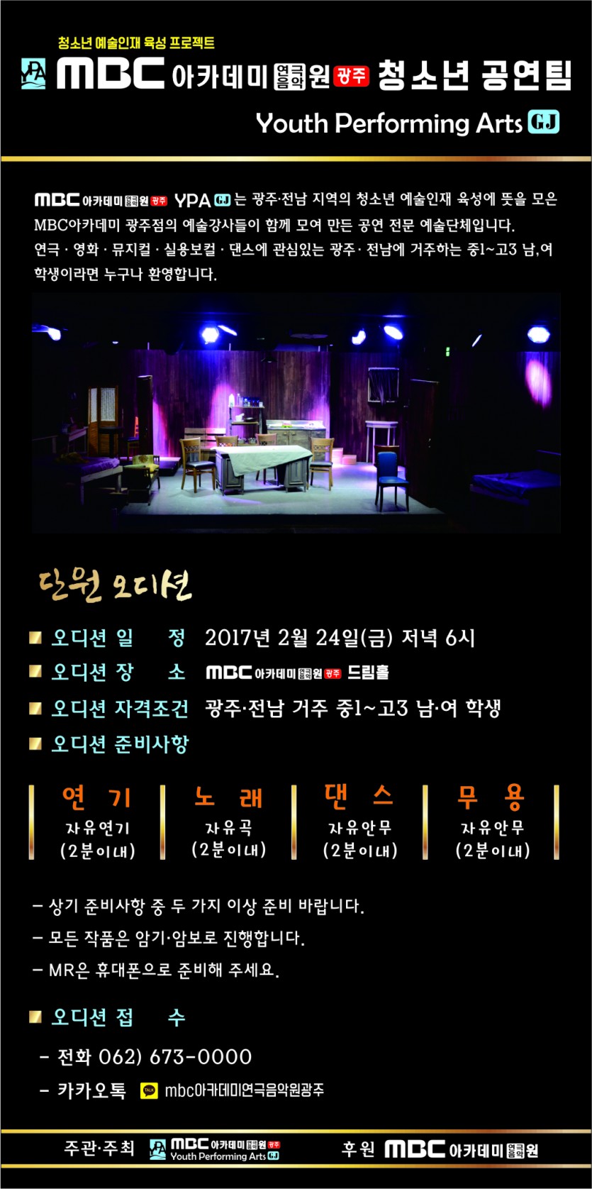 MBC아카데미연극음악원[광주] 청소년공연팀 오디션 [Youth Performing Arts GJ] 페이지 정보 작성자 관리자 댓글 0건 조회 23,463회 작성일 17-02-01 15:50 본문 MBC아카데미연극음악원 청소년공연팀 오디션 목록 이전글 FNC 엔터테인먼트 내방오디션 17.02.07 다음글 [뮤직센터] 수험생 이벤트 16.11.24
