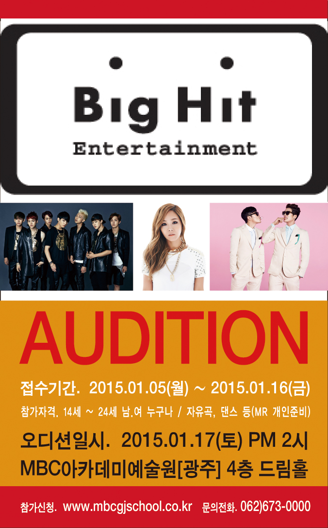 빅히트엔터테인먼트 오디션 페이지 정보 작성자 관리자 댓글 0건 조회 22,977회 작성일 15-01-22 18:30 본문 방탄소년단, 옴므, 임정희 등 소속되어 있는 빅히트엔터테인먼트 오디션 목록 이전글 N company entertainment AUDITION!!! 15.02.10 다음글 키이스트 오디션 14.11.12